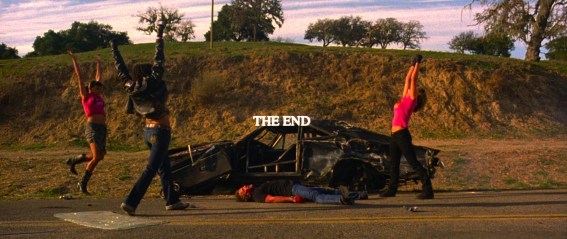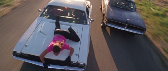 Naturally, there isn’t a great deal of Yelp-style movie critics who have gone so far as to take a pop at the action in Death Proof. Personally, I feel the two major action set pieces deserve all the praise they can get, so here’s some more. During a decade of increasing overwhelmingly poor CGI in Hollywood action, Tarantino bucked the trend with consecutive high-profile releases that incorporated various different aspects of brutal old school cinematic stunt work. While Kill Bill demonstrated Hong Kong legend Yuen Woo-Ping’s masterful fight sequence techniques, Death Proof gave us the finest example of pure vehicular stunt action since 1998’s Ronin. The head on collision that wipes out the ladies in Austin, Texas is a multi-angle smash-up both executed and presented with gut-wrenching aplomb. Then there’s the finale. A throwback to the dirty-cool muscle car movies of yesteryear, the lengthy car chase depicts not only a welcome dose of high-octane stunt driving (and death-defying hood riding by Zoë Bell), as Mike’s 1969 Charger hounds the girls’ 1970 Challenger, but also further evidence of Tarantino’s underrated action direction and, in this case, cinematography. The decisive, highly amusing final beatdown of Mike was made all the more enjoyable in hindsight by a confused lad I knew at uni, who, upon seeing the film, furrowed his brow and explained that one of the reasons he didn’t like it was because “out of nowhere, them three birds were all suddenly kung-fu experts”. See what I’m getting at here?